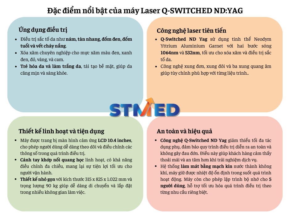 Công nghệ Laser Q-Switched Nd:YAG là một trong những phương pháp tiên tiến nhất hiện nay trong lĩnh vực thẩm mỹ và y học điều trị các vấn đề về da, đặc biệt là các sắc tố không mong muốn. Công nghệ này hoạt động dựa trên nguyên lý quang nhiệt chọn lọc, nghĩa là chỉ tác động vào các hạt sắc tố hoặc tế bào mục tiêu mà không gây tổn thương cho các mô da xung quanh.